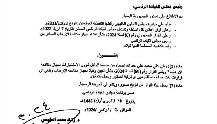 وتداولت وسائل إعلام في عدن وثيقة تتضمن توجيه من العليمي بإقالة “علي محمد الصياء“ وكيل شؤون الاستخبارات بجهاز مكافحة الإرهاب الذي يقوده شلال علي شائع.