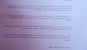 وأفاد البيان عدم عودة الموظفين إلى أعمالهم إلا بعد صرف مستحقاتهم وايداعها في حساباتهم.