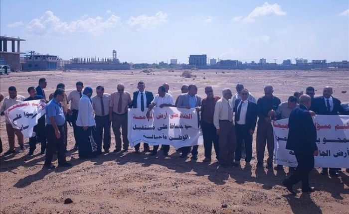 وسبق أن نظم أعضاء مجلس جامعة عدن، وقفة احتجاجية في مدينة الشعب بمديرية البريقة، رفضاً للاعتداءات المتكررة وعمليات البسط التي تتعرض لها أجزاء واسعة من أراضي الحرم الجامعي، من قبل أشخاص نافذين في المحافظة التي تسيطر عليها قوات المجلس الانتقالي الجنوبي.