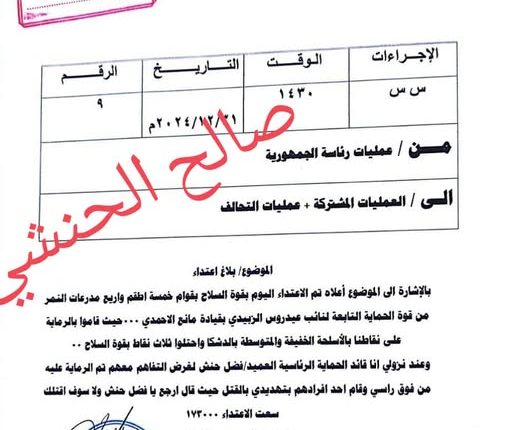 ونشر صالح الحنشي مدير إذاعة أبين السابق صورة من المذكرة التي بعثها مكتب العليمي لقوات التحالف المشتركة.