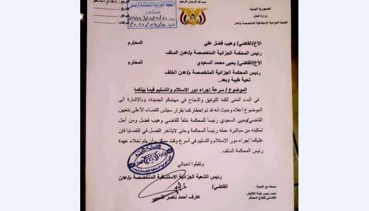 عدن.. عزل رئيس المحكمة الجزائية بعد كشفه تلاعباً بقضية الحمادي..!