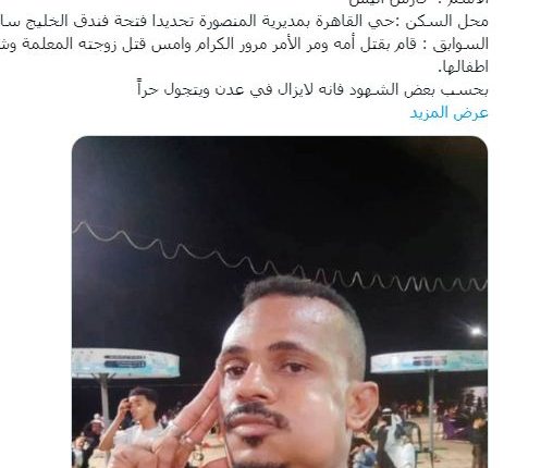 وقال رئيس تحرير موقع “عدن الغد” ان القاتل يدعى فارس انيس، مشيراً إلى انه توعد اخوان زوجته القصر بالقتل.. وأشار بن لغبر إلى أن انيس لا يزال طليقاً في عدن ويتجول بحرية وسط مخاوف من تنفيذه جريمته التي تعد الثالثة.