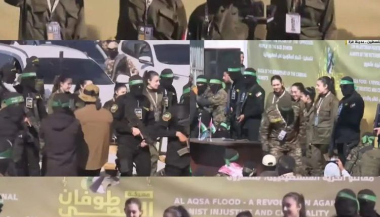وشوهدت المجندات يصعدن إلى المنصة مع مقاتلي “القسام”، الذين حملوا بنادق تعود للجيش الإسرائيلي، وسط هتافات لفلسطينيين تحيي المقاومة.