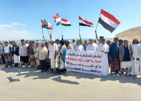 نفّذت لجنة الاعتصام السلمي في مديرية قشن بمحافظة المهرة، الأحد، وقفة احتجاجية رفضاً لتسليم موقع لمشروع إنشاء لسان بحري في جبل شروين لشركة “إجهام للطاقة” الإماراتية.