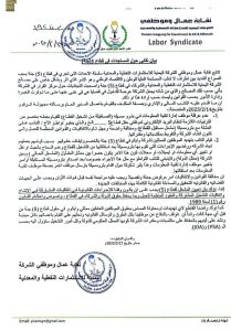 وأكدت النقابة- في البيان- رفضها القاطع لأي تهديدات أو محاولة المساس بحقوق الموظفين العاملين ممثلي “وايكوم” في حقول قطاع (5) جنة من قبل أي جهة كانت، و”إننا لن نتوقف بالدفاع عن موظفينا بكل الطرق والوسائل القانونية ونحثهم على القيام بأعمالهم بكل مهنية ونشد على أيديهم للحفاظ على مكتسبات ومقدرات الشركة كونها الممثل الحكومي للدولة وكل أمور التشغيل ستؤول إليها”.