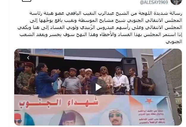 ونشر ناشطين من يافع مقطع فيديو لعبد الرب النقيب عضو هيئة رئاسة الانتقالي ونقيب مشايخ يافع.. ويظهر النقيب بالمقطع وهو يهدد الزبيدي ويتهمه بقيادة لوبي الفساد، ملوحاً بانقلاب داخل المجلس للحيلولة دون خسارة المجلس لحاضنته الشعبية.