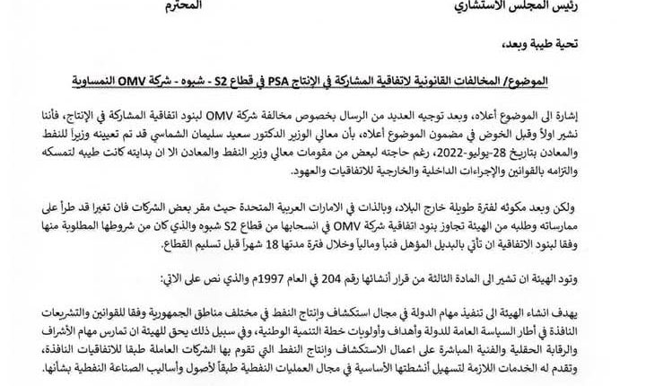 وفي نص الاستقالة، قال باحميش إن قيادة وزارة النفط مكنت شركة OMV النمساوية من الانسحاب من قطاع S2 – شبوة دون الالتزام بشروط الاتفاقية، وأن الوزارة لم تلزم OMV بإيجاد بديل مؤهل ماليًا وفنيًا قبل الانسحاب، ما يشكل مخالفة واضحة لاتفاقية الامتياز النفطي والقوانين المنظمة لهذا القطاع الحيوي، معتبرًا ذلك تفريطًا في حقوق الدولة وإضرارًا بالمصلحة الوطنية.