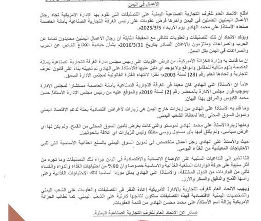استنكر الاتحاد العام للغرف التجارية الصناعية اليمنية، التصنيفات التي تقوم بها الإدارة الأمريكية تجاه رجال الأعمال اليمنيين، وآخرها فرض عقوبات على رئيس الغرفة التجارية الصناعية بأمانة العاصمة علي محمد الهادي.