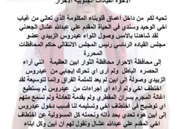 “أبين“| عقب زيارة الزبيدي إلى المحافظة.. شقيق المختطف “علي عشال” يصدر بيان صادم..!