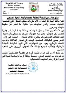 وأكدت اللجنة أن موقف اليمن الثابت في دعم القضية الفلسطينية يعكس شرف وكرامة الشعب اليمني، ويجسد موقفاً عربياً وإسلامياً أصيلاً في نصرة غزة ودعم المقاومة الفلسطينية.