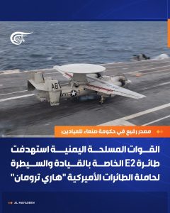 أكد مصدر رفيع في حكومة صنعاء، أن القوات اليمنية استهدفت طائرة E-2 الخاصة بالقيادة والسيطرة لحاملة الطائرات الأمريكية “هاري ترومان”، ما أدى إلى فقدانها للقيادة، مشيراً إلى أن البيت الأبيض ووزارة الدفاع الأمريكية (البنتاغون) يحققان في الأمر، وفق تصريح لقناة “الميادين”.