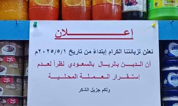 وتداول ناشطون صوراً لإعلان خطي وُضع على واجهة محلات تجارية في عدن، ينص بوضوح على أن “سداد الديون القديمة سيكون بالريال السعودي ابتداءً من تاريخ 01 مايو 2025”.