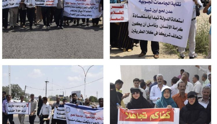 وكانت نقابة هيئة التدريس في جامعات عدن ولحج وأبين وشبوة، دعت كافة الأساتذة والطلاب للمشاركة في وقفة احتجاجية أمام مقر التحالف بمدينة الشعب في منطقة البريقة بمحافظة عدن.