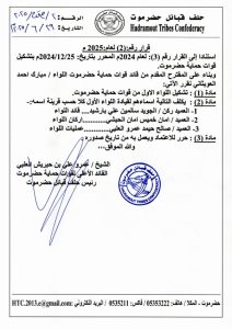وقضت المادة الأولى من القرار الذي نشره الحلف على صفحته بـ”فيسبوك” بتشكيل اللواء الأول من قوات حماية حضرموت.