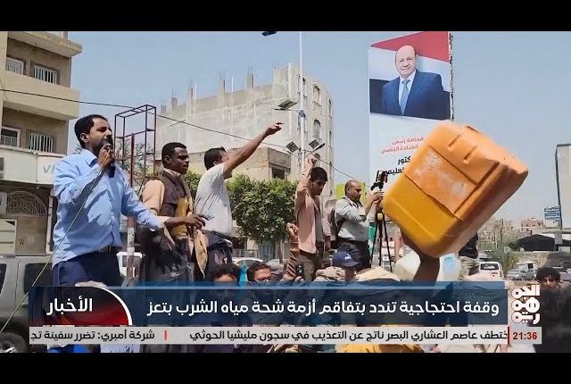 تظاهر المواطنون في مدينة تعز، الأحد، احتجاجاً على تفاقم أزمة المياه في المدينة الخاضعة لسيطرة الفصائل التابعة للحكومة الموالية للتحالف السعودي الإماراتي.