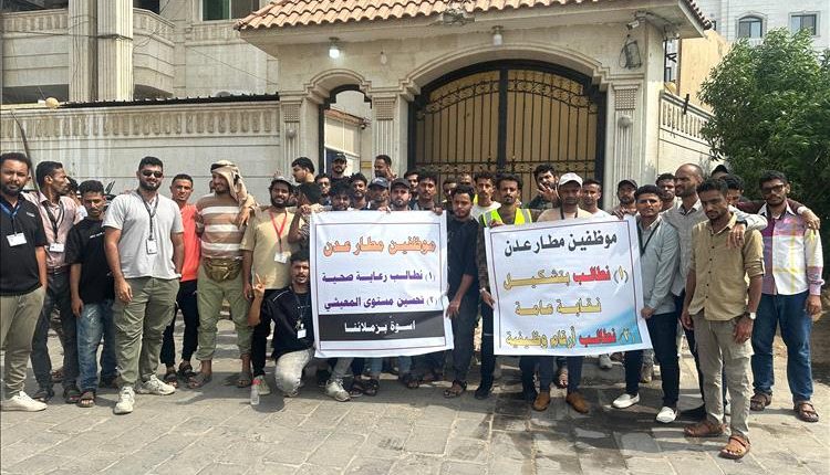 احتج موظفو مطار عدن الدولي، أمام مبنى الهيئة العامة للطيران المدني والأرصاد في محافظة عدن جنوب اليمن، للمطالبة بتحسين أوضاعهم الوظيفية والمعيشية.