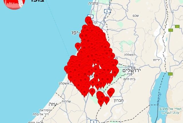 واللون الأحمر، وفق الخرائط، للمساحة التي تم تفعيل صافرات الإنذار فيها مع وصول الصاروخ اليمني الجديد “فلسطين 2”.