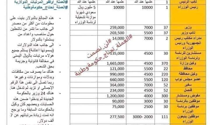 وبحسب مدير عام حسابات رئاسة الوزراء في عدن فتحي منجد فإن وزراء حكومة عدن يتقاضون اكثر من ربع مليون دولار شهرياً كمرتبات بمعدل 7 الف لكل وزير من أصل 37، بينما يستحوذ قرابة 30 مستشار لرئاسة الوزراء على 135 الف دولار.. ويذهب قرابة مليون دولار لنحو 220 وكيلاً للمحافظات بمعدل 4500 دولار يليهم أعضاء مجلس نواب يستحوذون على 660 الف دولار بمعدل 5500 دولار.