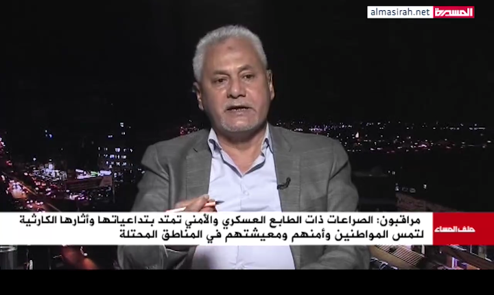 ستضافت قناة المسيرة مساء اليوم محافظ محافظة ابين الاستاذ حسين زيد بن يحيي في برنامج ملف المساء على قناة المسيرة حيث تحدث حول تجدد الاقتتال بين المرتزقة في المناطق الجنوبية وتحذيرات من نقل مناطق عسكرية من مارب الي شبوة .