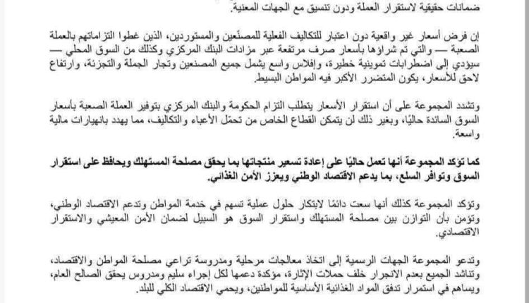 و شددت المجموعة على أن استقرار الأسعار يتطلب التزام بتوفير العملة الصعبة بأسعار السوق السائدة حاليًا، وبغير ذلك لن يتمكن القطاع الخاص من تحمّل الأعباء والتكاليف، مما يهدد بانهيارات مالية واسعة.