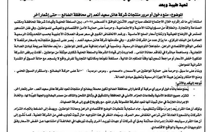 التعميم الصادر عن إدارة أمن الضالع وجه قادة الحزام الأمني والنقاط الأمنية بمنع دخول أو مرور شاحنات منتجات شركة هائل سعيد أنعم إلى المحافظة حتى إشعار آخر، وبرر التعميم الإجراءات ضد المجموعة الصناعية والتجارية بسبب بقاء الأسعار مرتفعة رغم انخفاض أسعار الصرف.