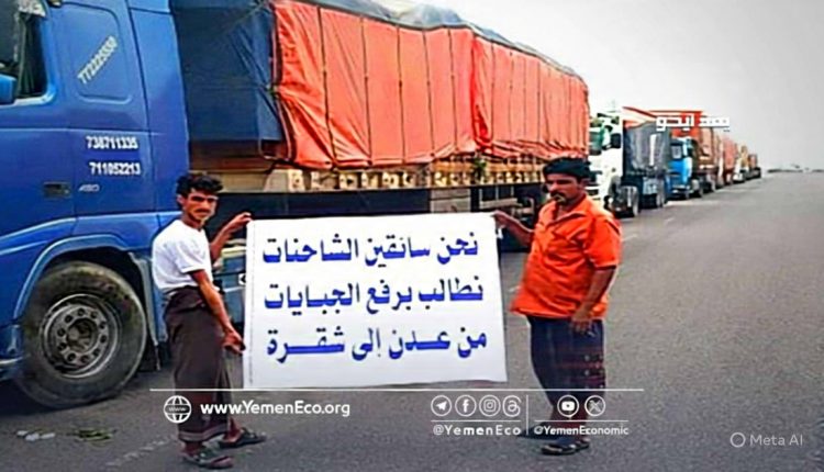 وأشارت المصادر إلى أن الجبايات المفروضة في بعض مناطق سيطرة المجلس الانتقالي المدعوم إماراتياً تصل إلى 500 ألف ريال للشاحنة الواحدة.