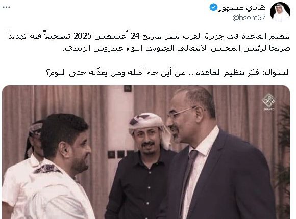 وقال هاني مسهور القيادي بالمجلس الانتقالي، المقيم بالإمارات، ان تنظيم القاعدة نشر تسجيلاً يهدد به بشكل صريح باغتيال الزبيدي.