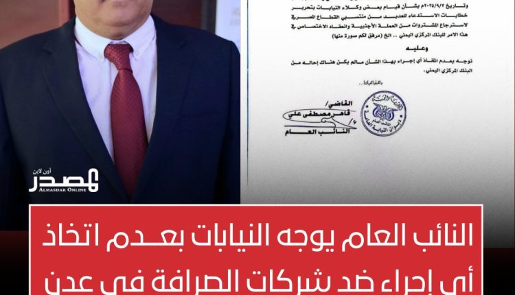 وجّه النائب العام التابع لحكومة الشرعية القاضي قاهر مصطفى علي، أوامر صريحة إلى رؤساء النيابات بعدم اتخاذ أي إجراءات قانونية ضد شركات ومحال الصرافة في عدن، مؤكداً أن الرقابة على تداول العملات الأجنبية وتنظيم السوق هي من اختصاص البنك المركزي حصراً، وفق وثيقة رسمية صادرة عن مكتب النائب العام بعدن، تداولتها وسائل الإعلام.