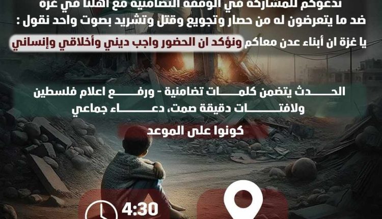 “عدن“| في خطوة هي الأولى من نوعها.. دعوات للمشاركة في أكبر تظاهرة شعبية واسعة يوم غد الجمعة تضامناً مع غزة..!
