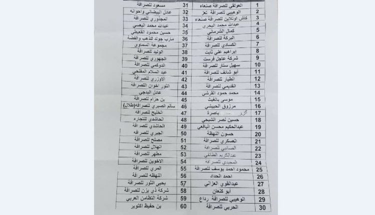 ويمنع التعميم الجديد، التعامل مع كافة الشركات والصرافين المحددين في القائمة، وعدم فتح اي حسابات لديهم إبتداء من الثلاثاء 26 يناير الجاري.
