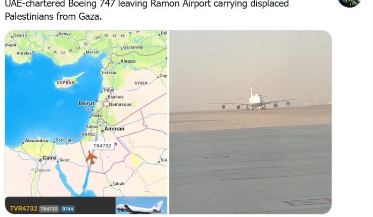 وتكشف المواقع طائرة بوينغ 747 الإماراتية وهي تغادر مطار رامون إلى وجهة غير معروفة. وتقل الطائرة، وفق منصات غربية، عدداً من سكان غزة لتوطينهم خارج القطاع.