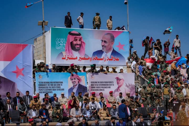 وأظهرت صور لساحة فعالية نظمها انصار الانتقالي في مدينة الضالع، مسقط رأس رئيسه عيدروس الزبيدي، خلوها من أية صورة لرئيس الامارات أو حتى اعلام الدولة التي ظلت تخيم على فعاليته على مدى العقد الأخير.. واكتفى الانتقالي لأول مرة برفع صور ولي العهد السعودي محمد بن سلمان بمعية رئيسه فقط وهي فارقة غير مسبوقة في تاريخ المجلس المنادي بالانفصال والذي اسسته الامارات في العام 2015.