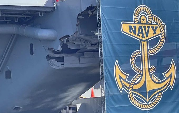 وقالت وسائل الإعلام الأمريكية، إن البحرية الأمريكية قامت بإخفاء حفرة عملاقة عمرها 8 أشهر في حاملة الطائرات “هاري ترومان” بعلم كبير أثناء خطاب دونالد ترامب في 5 أكتوبر/تشرين الأول، في قاعدة نورفولك البحرية في ولاية فرجينيا.