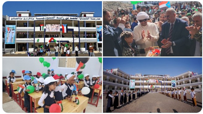 واجبرت الامارات الزبيدي على افتتاح مدرسة قديمة تم إعادة تلوينها بأعلام الامارات على انها من مشاريع الهلال الأحمر الاماراتي.