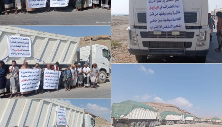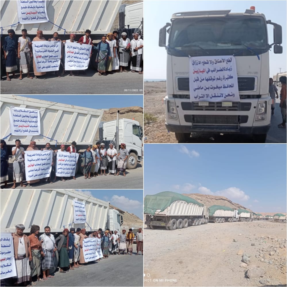 وقالت مصادر، إن عشرات من سائقي الشاحنات، أعلنوا الإضراب عن العمل في منطقة المطار بمدينة سيئون، احتجاجاً على فرض النقاط الأمنية جبايات مالية غير قانونية عليهم.