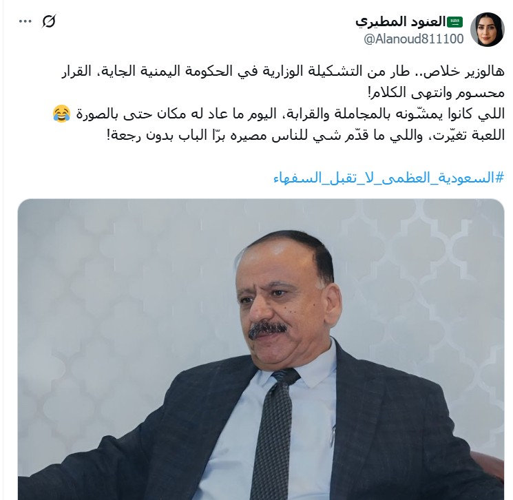ولمّحت منصات سعودية إلى إقالة وزير النقل في حكومة عدن والمحسوب على المجلس الانتقالي، عبد السلام حميد.