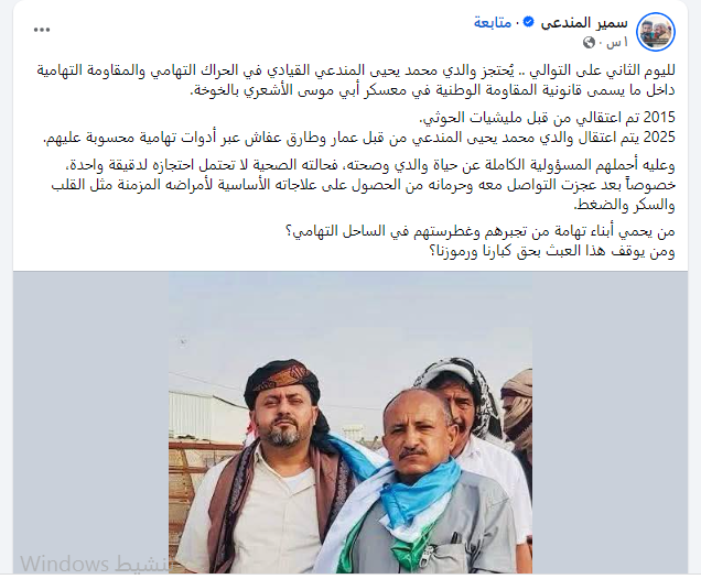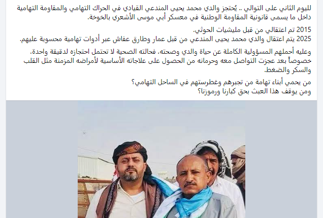 وحمل المندعي المسؤولية الكاملة عن سلامة والده للقياديين الموالين للإمارات، عمار وطارق صالح، مشيراً إلى أن منفذي عملية الاعتقال هم “أدوات عفاش” بحسب وصفه. وتساءل بغضب: “من يحمي أبناء تهامة من تجبر وغطرسة عمار وطارق عفاش في الساحل التهامي، ومن يضع حداً لهذا العبث بحق كبارنا ورموزنا؟”