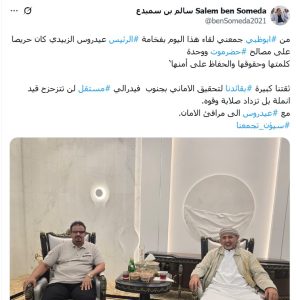 وبالتزامن مع التحركات الميدانية، شهدت أبوظبي لقاءً جمع رئيس المجلس الانتقالي عيدروس الزبيدي برئيس كتلة وحلف القبائل الموالي له، سالم بن سُميدع.