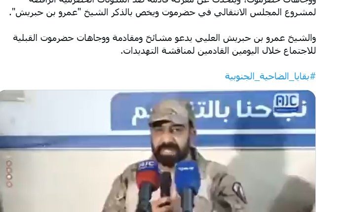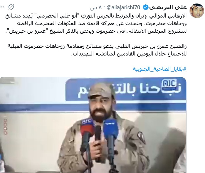 وكشف الصحفي السعودي المقرّب من الاستخبارات، علي العريشي، عن ترتيبات لعقد اجتماع موسّع يضم مشايخ وأعيان مديريات وادي وصحراء حضرموت خلال اليومين المقبلين، مشيرًا إلى أن اللقاء سيناقش “التهديدات الخطيرة” التي أطلقها أبو علي الحضرمي، الذي وصفه بـ”رجل الاستخبارات الإماراتية”، ضد زعيم حلف قبائل حضرموت الموالي للسعودية، عمرو بن حبريش.