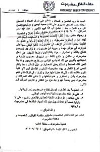 ودعا حلف القبائل أبناء حضرموت إلى “تلبية نداء الواجب الوطني” للدفاع عن المحافظة وثرواتها، وحثّ قوات النخبة الحضرمية على الالتحاق بأهاليهم “حتى لا يتحولوا إلى أداة لصالح جهات تسعى للسيطرة على حضرموت”، وفق نص البيان.