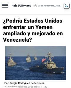 حذّرت شبكة تيليسور الفنزويلية من أن أي تدخل عسكري أمريكي في فنزويلا لن يُواجه بسيناريو شبيه بغزة أو سوريا، بل بمقاومة طويلة وقاسية أشبه بما واجهته الولايات المتحدة وحلفاؤها في اليمن.