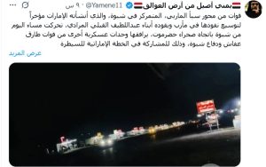 وأفادت مصادر قبلية في شبوة بأن فصائل ما يُعرف بـ”محور سبأ”، بقيادة نمران المقرب من نجل صالح عبداللطيف القبلي، إلى جانب وحدات من قوات طارق المتمركزة سابقًا في الساحل الغربي وفصائل دفاع شبوة، تلقّت أوامر بالتقدم عبر الطريق الصحراوي باتجاه مأرب.
