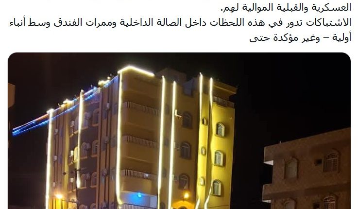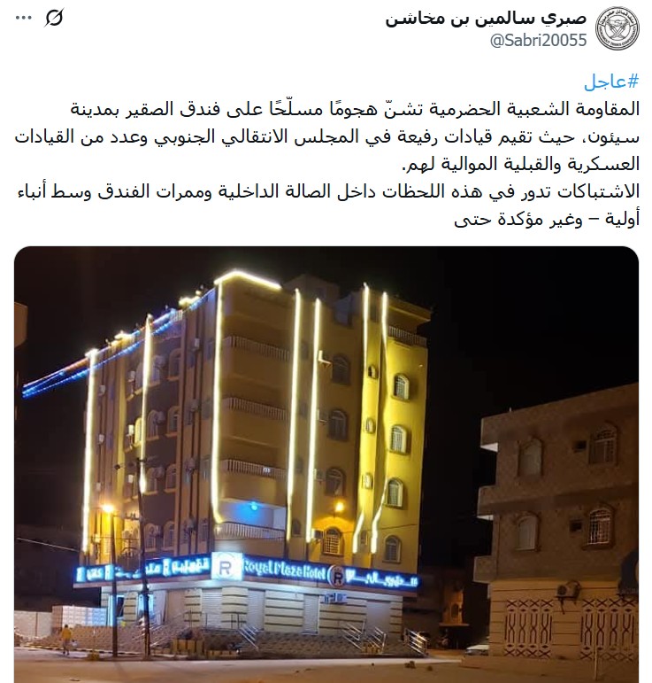 وقالت مصادر قبلية إن سيارات إسعاف شوهدت وهي تنقل ضحايا من داخل الفندق وسط انتشار أمني كثيف لقوات الانتقالي. وكان الفندق يؤوي قيادات قدمت من الضالع ويافع، قبل أن يتعرض لهجوم في وقت مبكر من صباح اليوم.
