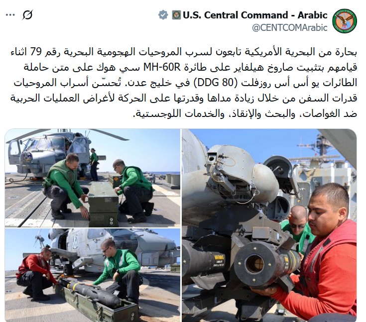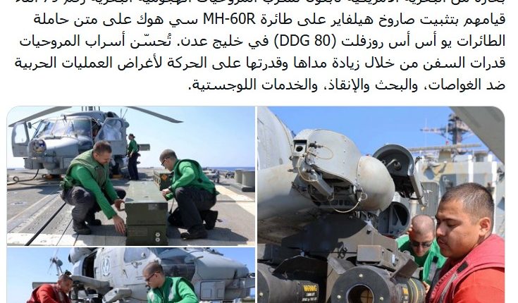 وأظهرت صور نشرتها القيادة المركزية للبحرية الأمريكية أفراد البحرية وهم يجربون استخدام صواريخ “هيل فاير” من على متن مروحيات، دون ظهور مقاتلات حربية على الحاملة، في خطوة اعتُبرت تجنبًا لأي تصادم مباشر مع صنعاء.