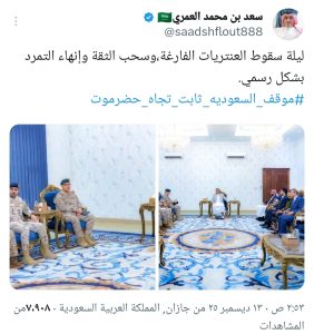 وكتب الناشط السياسي السعودي سعد العمري على منصة (إكس): “ليلة سقوط العنتريات الفارغة، وسحب الثقة وإنهاء التمرد بشكل رسمي”، وذلك عقب لقاء الوفد العسكري السعودي–الإماراتي برئيس المجلس لبحث ترتيبات الانسحاب من وادي حضرموت الذي سيطر عليه المجلس في وقت سابق.