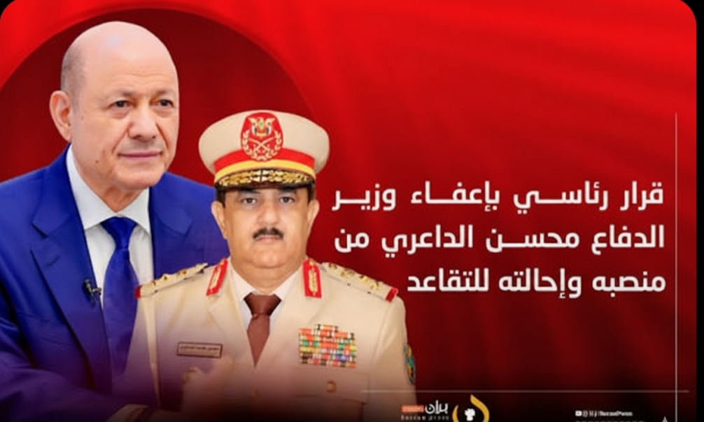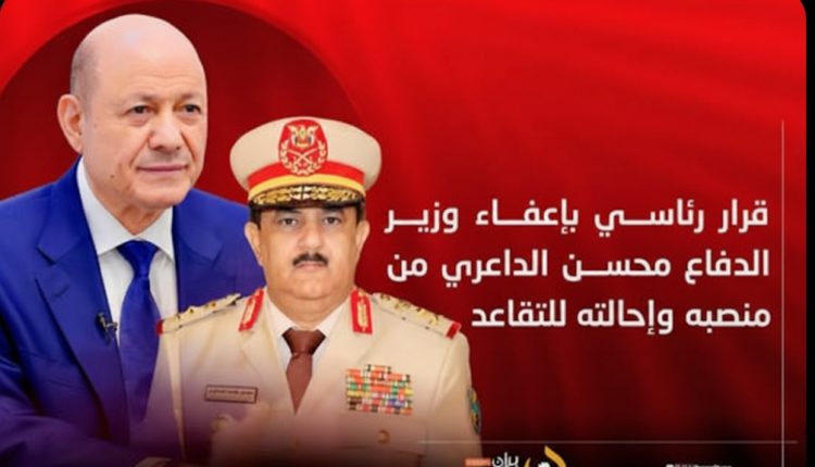 أصدر رئيس المجلس الرئاسي رشاد العليمي قرارًا بإقالة وزير الدفاع الفريق الركن محسن محمد الداعري وإحالته للتقاعد، ضمن سلسلة إجراءات تستهدف إعادة ترتيب القيادة العسكرية والسياسية في البلاد.