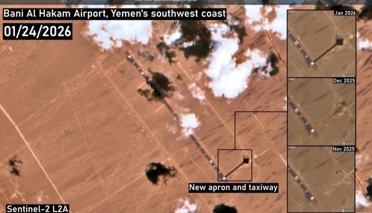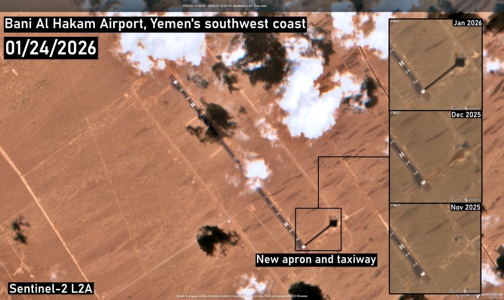 وتزامنت هذه الخطوة مع تسارع أعمال إنشائية وعسكرية في مهبط بني الحكم بمديرية ذو باب المطلة على مضيق باب المندب، حيث جرى استكمال ممر آليات بطول 560 مترًا، وإنشاء ساحة وقوف للطائرات بسطح أسفلتي حديث، ضمن مدرج يبلغ طوله 2.49 كم وعرضه 130 مترًا، ويضم حظائر محصنة ومرافق إقامة متكاملة.