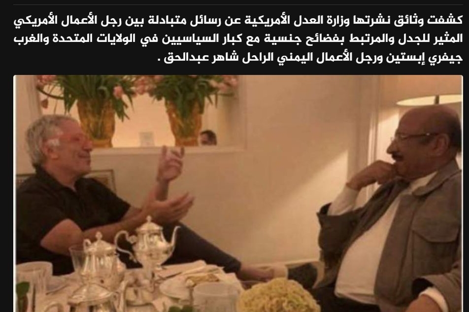 كشفت وثائق نشرتها وزارة العدل الأمريكية عن وجود مراسلات متبادلة بين رجل الأعمال الأمريكي المثير للجدل جيفري إبستين، ورجل الأعمال اليمني الراحل شاهر عبدالحق، تضمنت نقاشات مطوّلة جمعت بين أفكار استثمارية وعلاقات شخصية ورؤى سياسية تتعلق باليمن.
