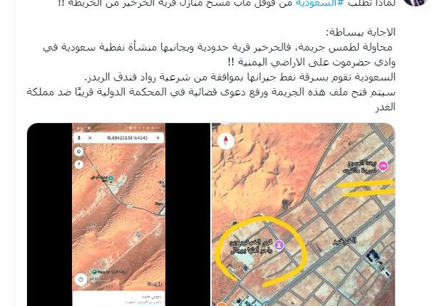 أثار التحرك السعودي الأخير على الحدود الشرقية لليمن موجة عارمة من الجدل والمخاوف السياسية، عقب تقارير كشفت عن بدء عمليات مسح وإزالة لقرى يمنية حدودية، تزامنت مع “اختفاء” مفاجئ لمنطقة “الخراخير” من خرائط محرك البحث “جوجل”.