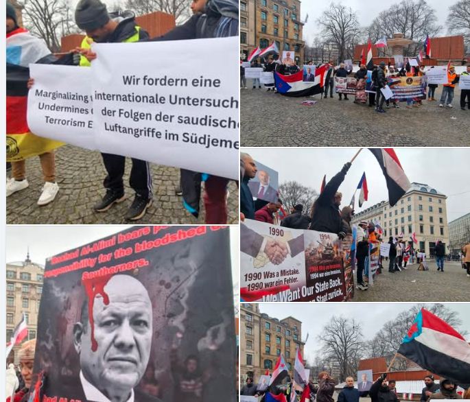 ونظم عشرات من أنصار المجلس الانتقالي تظاهرة أمام مقر مؤتمر ميونخ للأمن، الذي تستضيفه مدينة ميونخ، ويشارك فيه العليمي ضمن فعاليات المؤتمر.